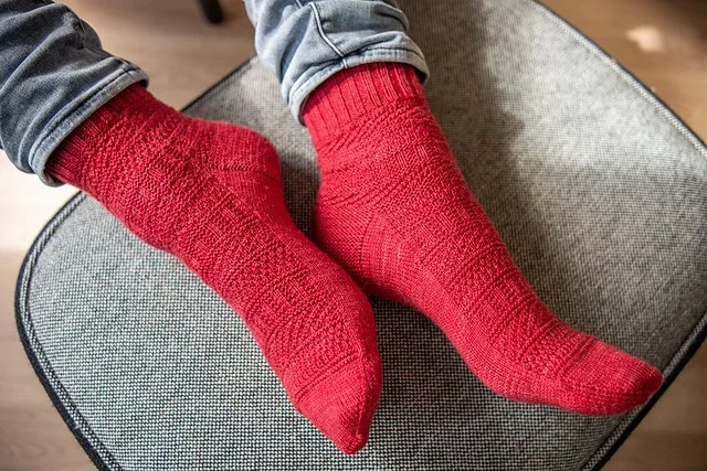 For our many Sock 101 Class students or those who just want to just level up a little bit, we offer Sock 102. This class works with fingering weight yarn and smaller needles. We now expect you to know how to work in the round. It is still your choice for DPNs or magic loop. We are still top down but we have a different kind of cuff. We are still just working with just knits in purls for a pattern but the pattern is more complex just a knit and purl. We still have a heel flaps, heel turn, and a gusset just like the other pattern but we a have a pattern to maintain. There are many similarities to what we learned in Sock 101 and this class. We are just turning it up a notch. Just remember, we are here to help you with this sock and your OTHER sock. Like always, you can join in person or via Zoom.