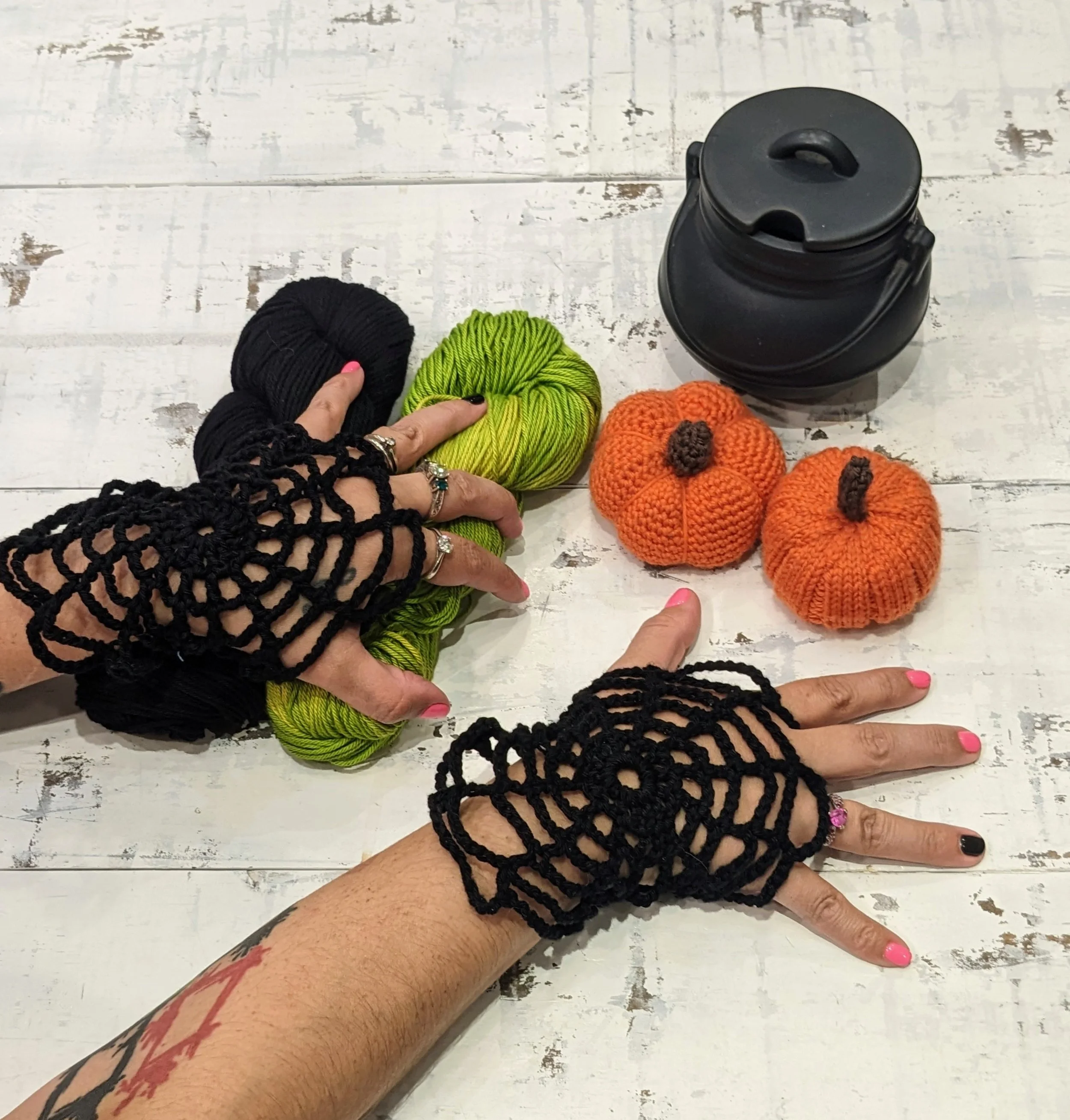 Need a light Halloween flair for everyday October day wear??? We have simple crochet spiderweb mitts. These are very simple to make and you only need to know how to chain, double crochet, and slip stitch! We made these in Malabrigo Verano Pima Cotton. The yarn is so soft on our skin and does not get hot. Perfect for California and for durable web mitts. This is an one 3-hour class you and should be (depending on your level)able to finish a pair of fingerless gloves. Don't worry if you don't. We offer help still. We have drop-in help classes and private lessons that you can sign up for to get your project finish. We have many fun yarns to choose from. Pretty soon you will be making them for everyone you know and in every colour. You are welcome to join class in person in person or via Zoom. Just sign up right away to reserve your spot.
