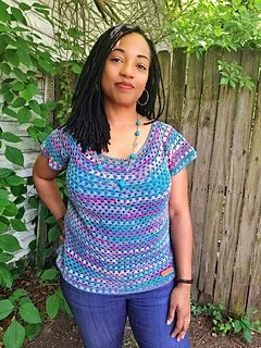 This super fun & cute granny stitched crochet tee is a circular yoke top with slightly fluttery sleeves. Constructed in the round from the top down. Basic crochet knowledge is required including chaining, single crochet, and double crochet. You will learn to foundation, single crochet, and double crochet decrease. Worked in fingering this sweet little top can be done all in one color or you can stripe it or make every row a different color and fade it, that would be lovely too! The pattern is carefully constructed to be size inclusive from small to 5X. We have lots of beautiful fingering yarns in the shop to choose from. Malabrigo sock yarn, Purls & Postulates, Rebel Yarns, Red Stag just begin to name a few!