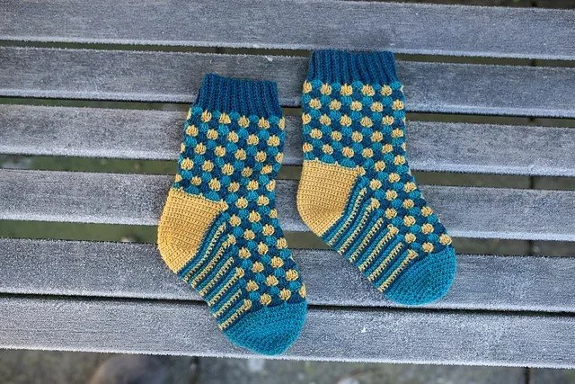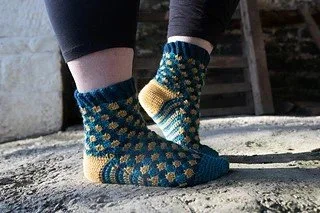 Whether you are a crochet sock lover or just curious, this is the crochet pattern for you. Flex your crochet muscles with brand new techniques and a wonderfully stretchy unisex pattern. The pattern is written in UK terms and we will decode it to US terms together. Sizing for everyone in the family, from baby to a large adult male foot. Basic crochet knowledge required, chaining, single crochet, half double crochet, double crochet, slip stitch, working in rows. You will learn working in rounds, working into row ends, skip stitches, spike stitches, short rows, decreasing, and Joanne's Elastic Rib. Crocheted in fingering, sock weight yarn,we have many lovely yarns to choose from in the shop. Please stop by and we will be happy to help curate a color palate for this project. Construction is from the cuff down. Pattern features written instruction and a helpful chart. Come join in the fun of crocheting your very own size to fit socks.