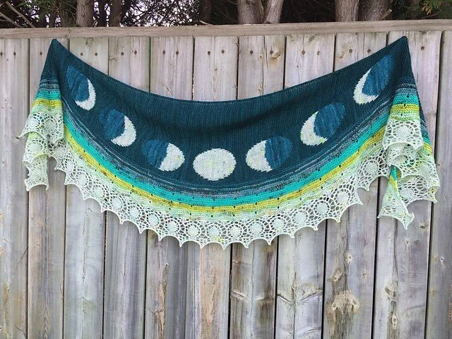 Many of you have admired the Ocean Moon Shawl on display in the shop. So, if you are ready to wrap yourself in the night sky then come join us and knit your very own Ocean Moon. There are two designs to choose from. One has the phases of the moon, while the other gives you the option to create star constellations. Basic knitting skills are required: Long tail cast on, Knit, and Purl stitches. You will learn the tips and tricks to master intarsia, I-cord edge, eyelets, color work charts & lace pattern charts in this dreamy moon phase design. Alicia will be there to help you through every phase of the moons. If you woul like help coordinationg your colors please stop by the shop and we will be happy to help you with color selection. Choose your Ocean colors from the many lines of hand deyed yarns we carry Purls & Postulates, Red Stag, Rebel Yarn, Corn Bread & Honey, Straw Berry Blond and Dye Candy as well as a lovely selection of Malabrigo fingering yarn we have on hand.