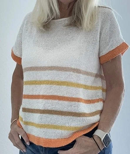 So Summer Shirt with it's turned hems and a perfectly relaxed round neck, it makes for a casual and easy to wear top that is size inclusive from XS up to 5X. Can easily be adjusted to a longer length if you prefer, purchase a little extra yarn? Go plain or jazz it up with stripes, itβs up to you. So get creative or keep it vanilla. Use fingering yarn in cotton or one of many merino yarns we have to choose from. Basic knitting skills are required for this class including how to cast-on, knit, and purl. You will learn knitting in the round, ribbing, if desired, increasing, holding stitches, three needle bind off, wet blocking. Construction is from the bottom up, worked separately for the front and back, and seamed at shoulders. Spoiler there is also a pattern for So Summer Shorts to go with this top! But that will be for another class. So come join us and add this sweet summer tee to your wardrobe.